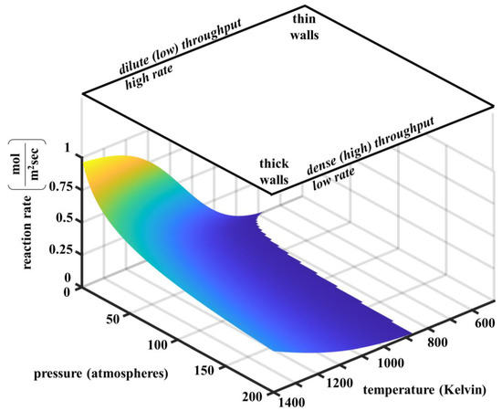 The reversible catalytic methane kinetics discovered (Table 1, Equation (5)) have implications for reactor design. These reaction effects are summarized as a three-dimensional Levenspiel plot in Figure 5 [57]. Figure 5 shows that low pressure and high temperature enhance reaction rate and hydrogen production. However, dilute gas conditions at these conditions impede dense and productive reactor throughput. Conversely, high pressures support rate and allow dense reactor throughout, but limit maximal methane conversion via Le Chatelier’s principle. Thus, high pressure constrains maximal reaction extent. Figure 5 overlays these and other tradeoffs that result from reaction equilibrium.
