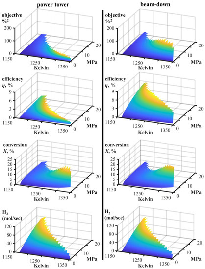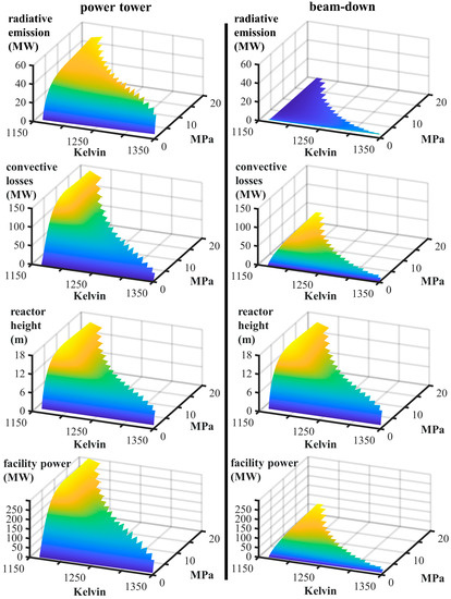The best simulated power tower and beam-down reactor designs across potential operating pressures from 2 to 200 atmospheres and 1150 to 1350 Kelvin.