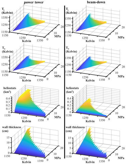 Power tower designs showed poor energy efficiency in methane reaction for hydrogen production. This approach directed only 1.7% of incident solar radiation into fungible chemical fuel (H2). Conversely, beam-down reactors achieved 9% efficiency. Although power tower and beam-down receivers were largely uniform in their reaction and physical characteristics (Figure 6, Figure 7 and Figure 8), including ultimate reactant conversion to H2 product, power towers showed radiative and convective energy losses a magnitude larger than beam-down designs (Figure 6). Overall power tower receivers, versus buried beam-down receivers, suffered from exposure and energy losses to the environment through convection and radiative emission. Poor power tower energy performance was highlighted by the large heliostat field a Solar Two tower would require (Figure 8). Figure 8 shows that although receiver temperatures and wall thicknesses were similar across facility operating conditions, the best power tower design demands a heliostat field of 0.18 km2 to overcome radiative and convective losses. Conversely, the best beam-down heliostat field was 0.04 km2, which likely entails lower facility capital and maintenance costs. Notably, 30–50% of solar facility costs are sunk in heliostat fields, which parasitically consume 3.8% of facility power and require persistent calibration [48,49,62,63,64].