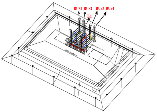 The investigated system is a 110-kV substation with three-phase GIS modules placed in a dedicated building. The substation has a double bus configuration containing four GIS modules, further noted from BUS1 to BUS4, and a bus coupler (BC) arranged in a horizontal layout. The two-bus system of the double bus configuration is placed vertically, one on the top of the other (see Figure 1).