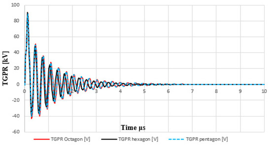 Figure 3. Transient ground potential rise during lightning surge scenario, pentagon-, hexagon-, and octagon-based geometries 10 μs.