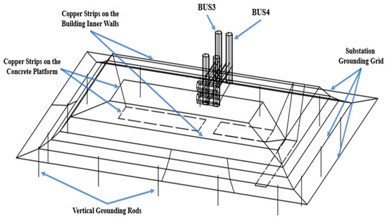 Figure 7 illustrates the CAD model considering the final analysis stage, single bus GIS configuration (containing only the faulted bus). The purple dots, highlighted in Figure 7, represent the established analysis locations across the substations, as follows: upper side of the BUS4 (faulted bus) enclosure, grounding lead that connects BUS4 enclosure with the earthing system, copper strip located on the GIS platform, copper strip located on the inner wall of the GIS building, and vertical rod.
