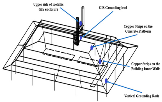 The grounding grid layout can be described as follows: A copper strip contour (40 × 5 mm) is located on the GIS platform surroundings to which each GIS module is connected through two copper grounding leads. On the inner wall of the GIS building an additional copper strip contour is installed at h = 0.3 m, which ensures the conduction paths toward the external grounding system. Three copper conductor contours are buried outside the GIS building at different depths with respect to the soil surface and different distances from the GIS building wall. Taking into account the very fast time distribution of the transient regime, the auxiliary equipment located near the GIS building (autotransformers, lightning protection systems, etc.) were not considered during the computational process. The geometrical characteristics and the implemented materials, adopted during the computational process, associated with the system components are presented in Table 1.