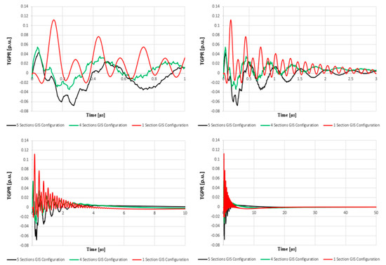 Through overlapped graphical representations and numerical comparisons of the TGPR waveform computed for different GIS configurations, the transient response of the substation during voltage breakdown fault is assessed. This analysis will determine if the computed values of transient ground potential rise generated throughout the substation during phase-to-enclosure fault considering a single GIS bus section (the last stage of the investigation, see Figure 7) provide the worst-case scenario, within acceptable deviation range from the full GIS configuration model. As a result, a suitable modeling technique will be achieved and presented, and, therefore, the computational domain could be reduced for further analysis and investigations. Moreover, the transient response of the grounding grid in the presence of the metallic enclosure will be assessed and discussed. Due to the fact that there was no available 3D model representing the entire GIS metallic ensemble, quantifying the impact of the enclosure on the grounding grid performance when very-high-frequency transients flowed throughout the system was an impossible task. The response of the grid was expected not to be uniform across the substation, although it is based on the approximative symmetrical geometric shape of the earthing system due to the presence of the metallic enclosure. It is well known that during the very fast transient regime the effective area of the grounding grid is significantly reduced and, therefore, the grounding grid subsystems responsible for the fault energy clearance will be identified.