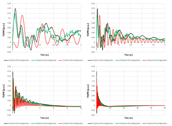 When the parametric study is employed several discussions can be initiated regarding the quantification of each GIS bus section into the overall transient response of the system. Through this type of analysis, the proper modeling technique is established. Moreover, through the number of GIS buses’ variation during the simulations, the stability and modularity of the proposed modeling technique are achieved. The outcome of the method in all simulation conditions is strictly related to physical phenomenon rather than pure numerical dependencies. According to the TGPR comparison presented in a previous section (see Figure 9, Figure 11 and Figure 12), the oscillatory character of the wave is damped within the traveling path due to resistive, inductive, and capacitive behavior of the metallic ensemble. Therefore, the frequency attenuation coefficient is directly proportional with the length of propagation path and equivalent with the number of elements contained by the model. According to the maximum overvoltage amplitudes presented in Table 2, when three, four, and five GIS sections are contained by the model, the area of the grounding grid clearing the transient energy is located inside the GIS building. Moreover, the copper strip situated beneath GIS metallic enclosure (copper strip ring and the grounding leads) will dominate the damping effect provided by the grounding grid during voltage breakdown (see Table 2).