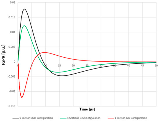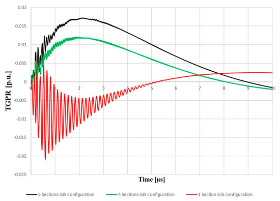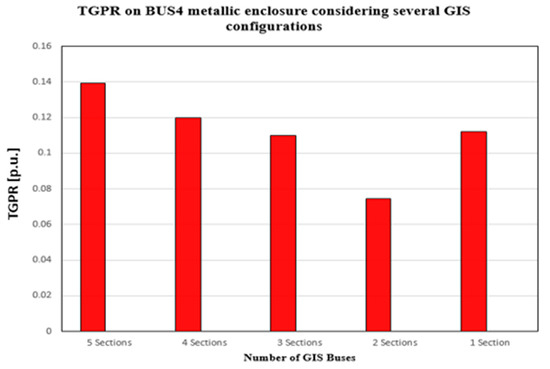 Figure 8 shows characteristics of TGPR on the grounding lead associated with BUS4 under influence of faulted bus enclosure with the earthing system considering five, four, and one GIS bus section’s(s’) configuration. The analysis was performed on the grounding lead that connects the faulted bus enclosure with the earthing system for different gas-insulated substation configurations.