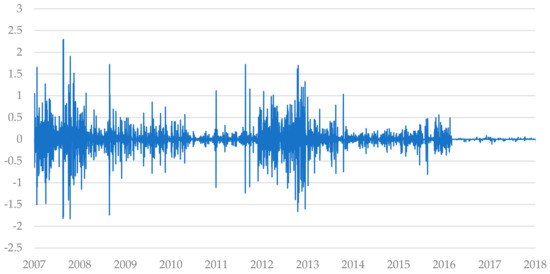 SREC log returns are presented in Figure 2. We used New Jersey daily SREC prices since New Jersey is the oldest and most developed SREC market in the U.S. The data ranging from January 2007 to March 2016 were obtained from NJC Clean Energy, while the data from March 2016 to the end of the sample period were obtained from Bloomberg. As our dataset contains observations from two separate sources, we carried out a reduced sample analysis using only data from NJC Clean Energy, excluding data from March 2016 onwards for robustness purposes. The volatility in SREC prices reduced dramatically starting from March 2016, as can be seen in Figure 2, giving us a further reason to carry out the same analysis on the reduced sample. The decrease in SREC price volatility is likely linked to the extension of the solar Investment Tax Credit (ITC) at the end of 2015: a 30% three year extension and an additional subsequent two year ramp down [74]. This extension provided the solar industry in the U.S. with a more stable investment climate, thus explaining the decrease in volatility. As a further robustness test, the reduced sample analysis was carried out not only on SREC prices but also on electricity prices.