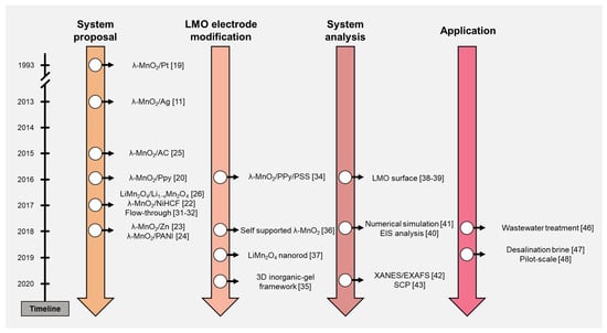 ELR systems using the LMO electrode are reviewed in this study. The timeline in Figure 2 briefly summarizes the contents of this paper. The ELR research using the LMO electrode can be classified and discussed by four categories: system proposal, LMO electrode modification, system analysis, and application. After the discussion of the literature, ELR system performance was organized and discussed further. Based on the trend and development process of the ELR system, we suggested the perspectives of this research.