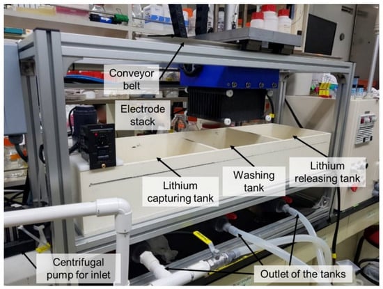 A λ-MnO2/Ag system that recovers lithium from the desalination brine was developed and evaluated by Kim et al. [47]. The desalination brine contained extremely low concentrations of Li+ (0.063 mM), which makes it impossible to manufacture the product with high Li+ concentration and purity through a one-stage ELR system. Accordingly, the research team invented a two consecutive recovery process that recovers Li+ once again from the Li+ recovered solution. The two consecutive recovery processes produced a recovery solution with high purity (up to 99.0%) and high Li+ concentration (190 mM). The authors compared the lithium recovery performance of the adsorption and ELR process and confirmed that the ELR system is much faster at capturing and releasing steps. As a follow-up study, Joo et al. designed and demonstrated the pilot-scale λ-MnO2/Ag system (as shown in Figure 3) to recover lithium from the actual desalination concentrate [48]. As the actual desalination concentrate retained only 0.035 mM of Li+, the two consecutive ELR process was designed to obtain the recovery product of high Li+ concentration (62 mM) and high purity (88 mol% of Li+). These studies have shown that the ELR system can be applied in actual practice even from a brine source at extremely low Li+ concentrations.