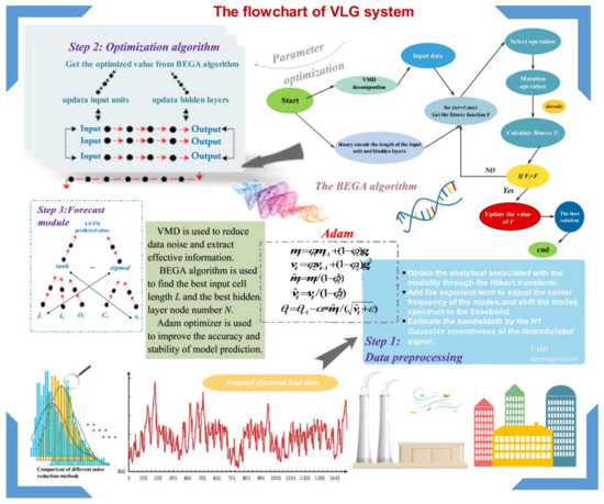 In this study, a VLG hybrid system for short-term load forecasting is proposed to improve the forecasting accuracy. This system mainly uses VMD technology to remove the noise of the original sequence to obtain a stable time series, which is used as the input feature of the model training and provides a high-quality training set for the model. Here, BEGA is used to adaptively optimize the length L of the input data sample unit of the LSTM and the number N of the cell units, allowing the LSTM to achieve optimal performance. The analysis framework of the prediction system is shown in Figure 2. The 1-step is VMD data preprocessing module, the 2-step is BEGA and Adam optimization algorithm module, and the 3-step is LSTM prediction module. The specific instructions are as follows.