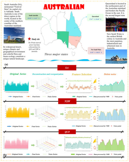 Figure 3 shows the power load data for South Australia, Queensland, and New South Wales. It is not difficult to see that the data fluctuations in New South Wales and Queensland are relatively stable, with South Australia fluctuating the most frequently. In the Figure 3, (a) is the situation of the three study regions. (b) is the feature selection part, which shows the decomposition results of power load series, and IMFs is arranged in descending order of frequency. Then, the high frequency IMF is removed and the remaining IMFs are reconstructed to obtain the optimal input sequence. The characteristics of the data series are obviously improved than the original ones.