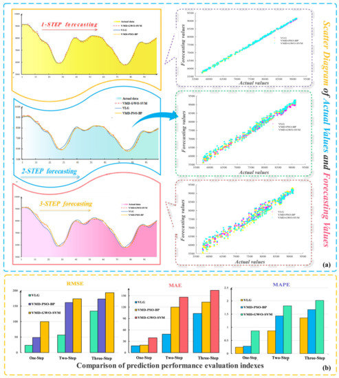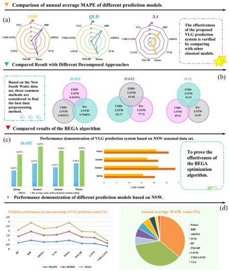 - The comparison results of the evaluation index system of VMD-LSTM and other hybrid systems are introduced in this table. The VMD-LSTM shows better prediction accuracy and prediction performance on most evaluation indicators. For the comparison between the single LSTM model and the VMD-LSTM system, it is obvious that the evaluation index of the VMD-LSTM system is superior to that of the LSTM model in all cases. At the same time, the prediction accuracy of all noise reduction models is higher than that of the model based on original data, which indicates that data preprocessing is indispensable for power load prediction.