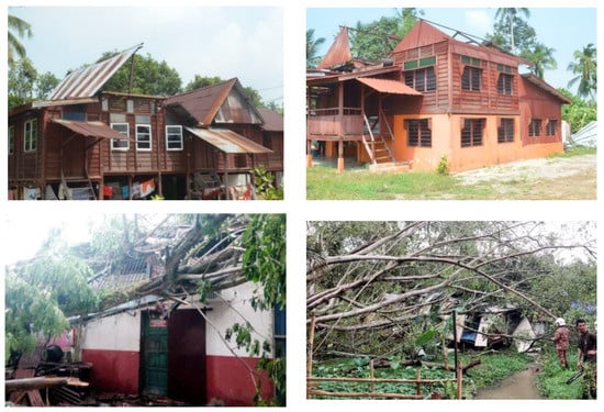 - Zaini, S.S.; Majid, T.A.; Deraman, S.N.C.; Chik, F.A.W.; Muhammad, M.K.A. Post Windstorm Evaluation of Critical Aspects Causing Damage to Rural Houses in the Northern Region of Peninsular Malaysia. In MATEC Web of Conferences, 2017; EDP Sciences: Ulis, France, 2017; p. 03016. [Google Scholar]