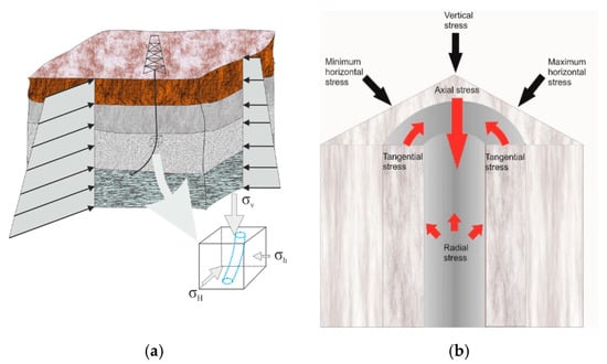 During the process of wellbore drilling, a certain volume of rock is removed and replaced by a drilling fluid. The required drilling fluid density is dependent on the subsurface formation pressure. Since the density of drilling fluid is lower than the density of the rock, redistribution of stress at the wellbore wall will occur [4,5,6,7]. In most cases, before the drilling, a subsurface rock formation is under an in-situ compressive stress state consisting of vertical (overburden) stress (σv) as well as minimum (σh) and maximum (σH) horizontal stress. After drilling, stress redistribution takes place at the vicinity of the wellbore wall causing changes in radial, axial and tangential stress. Regardless of stress alteration on the wellbore wall, at a certain distance from the wellbore, the rock is still under initial in-situ stresses (Figure 2). If the density of the drilling fluid and resulting pressure is too high or too low, results can be hydraulic fracturing or breakout, respectively, as dominant rock failure mechanisms while drilling. In case of directional or horizontal drilling, wellbore stability strongly depends on orientation of the wellbore with regard to initial in-situ stress [8].