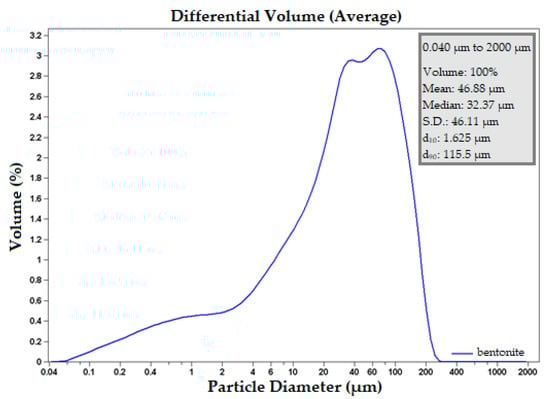 According to the appearance of the granulometric curve shown in Figure 3, it can be concluded that the Bentonite Tunnel Gel Plus sample shows a very wide distribution, with 75% of the particles ranging from 10 to 300 μm, while the average particle size is 46.9 μm.