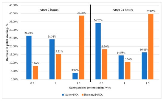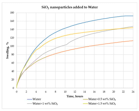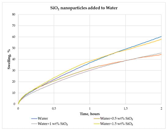 Figure 6 shows that 24 h swelling of pellets in aqueous suspensions at three different concentrations of SiO2 nanoparticles gives a similar swelling reduction pattern to 2 h. The most significant reduction of pellet swelling was recorded in the aqueous suspension with 0.5 wt% SiO2 nanoparticles (34.20%) after 24 h. In the aqueous SiO2 nanoparticle suspension (1 wt%), the swelling was reduced by 14.55% after 24 h, compared to the swelling in water with 1.5 wt% of SiO2, which was reduced by 16.41%.