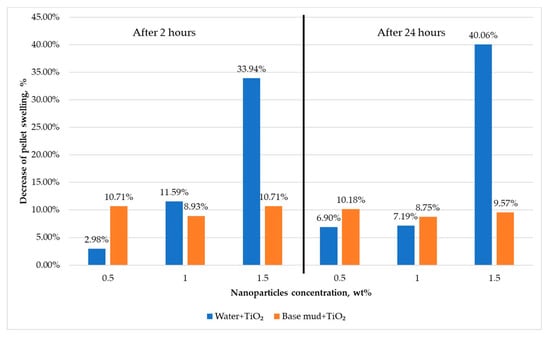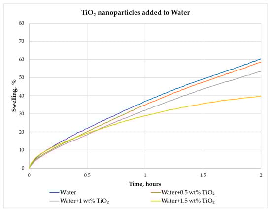 According to Figure 7, the swelling of pellets after 2 h in an aqueous suspension of 1.5 wt% TiO2 nanoparticles showed the most significant reduction of 33.94% compared to their swelling in water. In an aqueous suspension of 0.5 wt% of TiO2 nanoparticles, the swelling of pellets was reduced by only 2.98%, while in an aqueous suspension of 1 wt% of TiO2 nanoparticles, the decrease of pellet swelling was 11.59%.