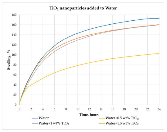 Figure 8 shows that the swelling of pellets in aqueous suspensions at two different concentrations of TiO2 nanoparticles (0.5 and 1 wt%) gives similar results for swelling reduction. In an aqueous TiO2 nanoparticle suspension (0.5 wt%), after 24 h the swelling was reduced by 6.90% compared to the swelling in water. In the case of the 1 wt% TiO2, the swelling was reduced by 7.19%. The best result was recorded in an aqueous TiO2 nanoparticle suspension (1.5 wt%), where the swelling of pellets was reduced by 40.06%.