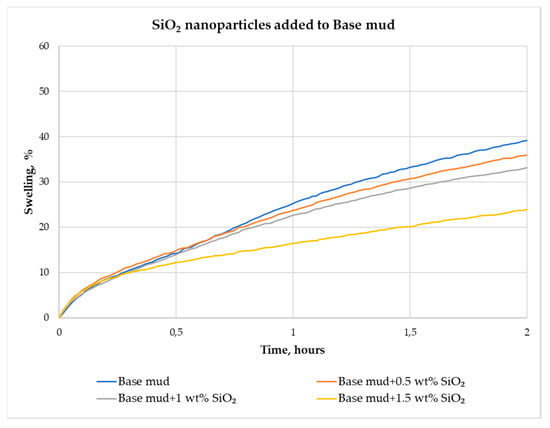 Swelling in base mud and in muds with added SiO2 nanoparticles within 2 h.