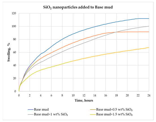 Swelling in base mud and in muds with added SiO2 nanoparticles within 24 h.