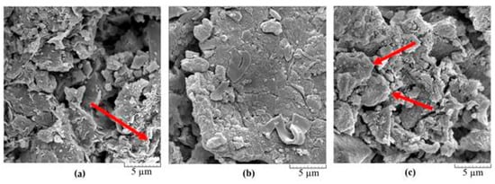 The changes in the structure and texture of the particles are scarcely noticeable in Figure 13a, while clay minerals (mainly Na-montmorillonite) remain relatively recognizable (see arrow). The sample shown in Figure 13b is more compressed, leakproof and more compact than the sample shown in Figure 13a, mainly as an aggregate of slippery particles (less noticeable grain with a recognizable crystal habit). However, it is necessary to determine the chemical composition of the sample and the individual particles in the sample to properly identify the particle type. The sample in Figure 13c resembles the sample swelled in base mud with almost imperceptible modifications to the sample—the morphology of clay minerals and other minerals is mostly undisturbed (arrows show clay minerals aggregates).
