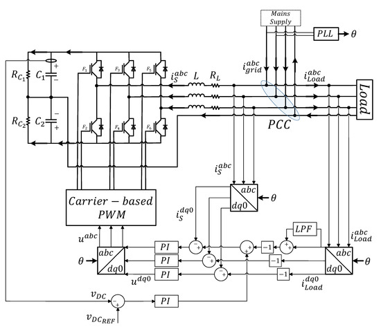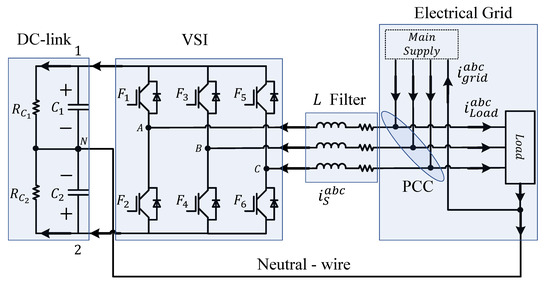 The TLSC SAPF under study is depicted in Figure 1. It is mainly composed of a split-capacitor DC-link ( and ) and a three-phase Voltage Source Inverter (VSI). The TLSC SAPF is connected in parallel at the Point of Common Coupling (PCC) through an L filter, and its function is to compensate the inefficient currents generated in the load, avoiding their circulation through the main supply. The neutral wire is directly connected to the mid-point of the DC link as presented by [31,32,33,34] to mitigate zero sequence currents produced by non-linear and unbalanced load components. Resistors , , and represent the converter losses, which reflect a more realistic approximation of the system.