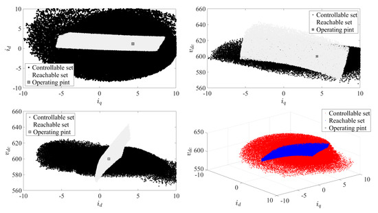 In this work, a set-theoretic approach is adopted to verify whether the TLSC SAPF is controllable. The controllability verification via the set-theoretic approach requires the computation of the reachable (), controllable (), and reversible sets, with the set of the state space from which the system can evolve and into in a given time (reader is referred to Appendix A for additional details regarding the set-theoretic approach adopted here.). The system controllability is guaranteed if . The controllability index () is used for quantifying the controllability of the system [42,43]: