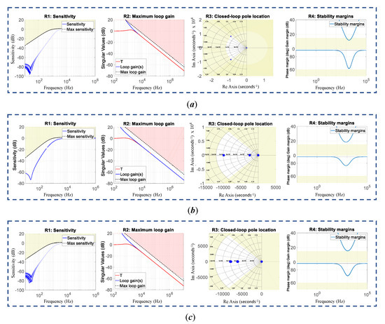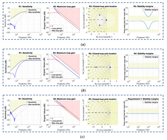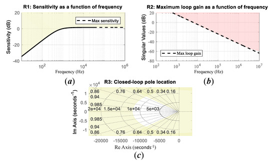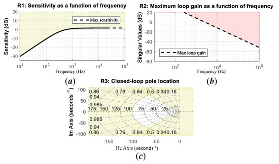 Closed-loop specifications for the structured DC-link PI structured controller: (a) R1 sensitivity function, (b) R2 maximum loop gain, and (c) R3 minimum damping and maximum natural frequency for the closed-loop poles.