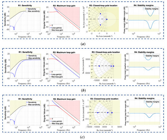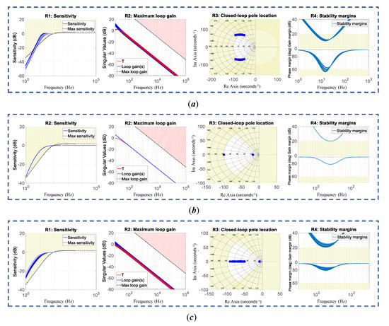 Closed-loop specifications’ verification for the loop: (a) Pole-Placement (PP)-PI, (b) -PI, and (c) -uPI.