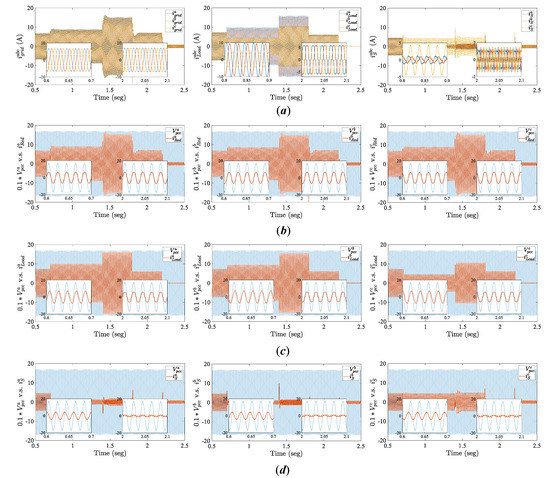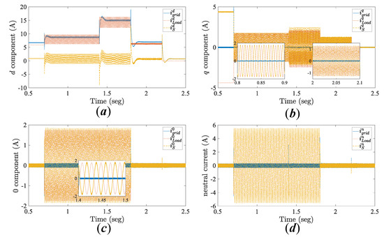 For a balanced source and load, the components in Model (5) reach a constant value when the system is in a steady-state condition, while the zero sequence is equal to zero. In contrast, for unbalanced loads, the components are composed of a constant quantity plus a small oscillatory part with twice the nominal grid frequency [37]. Furthermore, in the presence of harmonic loads, the components have other oscillatory components that depend on the order of the current harmonics [38].