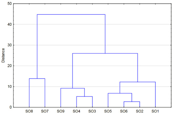 The objects form clusters, where four main groupings can be distinguished. The first one contains a single object (SO1), the second and the third groups are composed of three objects, while the fourth one comprises two objects (SO7, SO8). The shortest distance in the second cluster is represented by the objects SO6 and SO2, mainly due to the fact that they are characterized by comparable parameters for all eight variables. A single SO1 object differs in parameters from the remaining ones—it is assigned to a binary tree with similar characteristics.