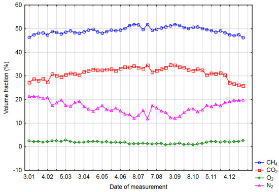 The gas generated in the waste deposit is a mixture of CH4, CO2, O2, N2 and other compounds, containing mainly carbon, sulfur and chlorine derivatives. The biogas density is lower compared to the air density (1.293 kg·m−3 under normal conditions), which has a significant impact on fugitive emissions from the landfill. The monitoring performed confirms the presence of the above-mentioned gases within the following ranges: CH4 36.2–49.2%, CO2 24.3–34.5%, O2, 1.8–6.1% and N2 14.1–32.8%, respectively. An active degassing system is currently a standard for this type of landfills, where gas recovered from the landfill deposit via a suction pipe is used for energy generation purposes [36,37].