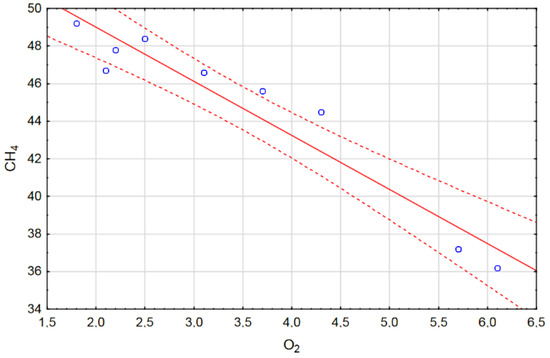 The scatterplot illustrates the negative correlation between CH4 and O2—the increase in the results of the variable Y (CH4) is accompanied by the decrease in the second variable X (O2), respectively. The least correlated points are the wells SO4 (x = 4.3; y = 44.5) and SO6 (x = 2.1; y = 46.7). The content of oxygen in the individual wells, ranging from 1.8 to 6.1%, indicates that oxygen is being sucked into the landfill from outside—i.e., the gas wells are leaking. A similar mechanism of action was noticed previously with attention paid to the quality of the surface structure of the landfill with some fissures as well as cracks resulting from uneven settlement of waste and improper compaction of waste [52].