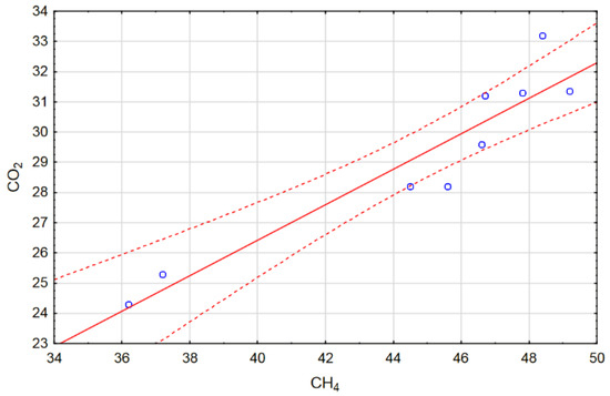 The scatterplot in Figure 4 shows the positive correlation between CO2 and CH4—the increase in the results of the variable Y (CO2) is accompanied by the increase in the second variable X (CH4). The least correlated points are wells SO3 (x = 45.6; y = 28.2) and SO5 (x = 48.4; y = 32.3). The average annual value of CH4 in the wells ranged from 49.2 to 36.2%, while the content of CO2 ranged from 34.5 to 24.3%, respectively. The percentage composition of main gas bespeaks the ongoing methanogenic processes in the waste deposit. Similarly, the previous findings provided the mechanisms of biogas generation in the landfilled waste content of CH4 and CO2, indicating the large fluctuations that are related to the conditions of gas generation [53,54]. As a matter of fact, the following conclusions has been drawn: the composition of the produced gas may have large fluctuations, despite the fact that internal production rates are constant and that the extent of stoichiometric fluctuations will increase with the decrease in gas production [55]. This means that gas composition displays hysteresis, and it is hard to determine the degradation state of the object on the basis of gas composition measurements performed once or at rare time intervals. Methanogenic processes that take place in the waste deposit depend on both external and internal factors, respectively. Hence, the composition of the gas produced, in particular, in a landfill in operation will depend, inter alia, on the level of waste compaction that has a profound impact on the formation of anaerobic conditions as well as on the migration of water from precipitation.