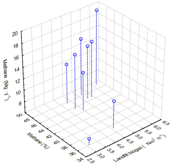It was found that the average annual stream of gas volume amounted to 4.76 m3·h−1 for the passive degassing installation composed of nine individual vertical degassing wells with gas burnt in the individual flares. Hence, it possible to generate 374.928 m3 of gas from the waste deposit during the year, which enables the neutralization of 125.3 of Mg CH4·y−1. This allows the generation of approximately 525 MWh of electricity per year in the CHP system with an efficiency of about 40% [56]. Figure 5 presents the average annual CH4 content in the gas and the capacity of the degassing installation.