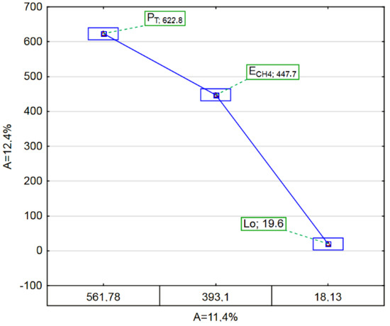 Hence, some input data, e.g., DOC, R, MSWT and F, were factual data—in this case the modeling results could be regarded as optimal. In fact, the parameter with a dominant impact on the final result is the content of carbon in the biodegradable organic part deposited in the landfill in a specific year (DOC). Component A (the residue of paper and cardboard products) was implemented in the model on the basis of the morphological composition of waste with a value of 11.4%. Thus, the model generated the total production of CH4 at the level of MgCH4·y−1, while a change of component A’s value by 1% upward will result in the increment of CH4 production PT by 9.8%, and the enhancement of ECH4 emission by 12.2%, respectively. Figure 6 illustrates the prediction of the quantity A = 11.4% implemented into the model—the forecast raised by 1%, i.e., A = 12.4%.