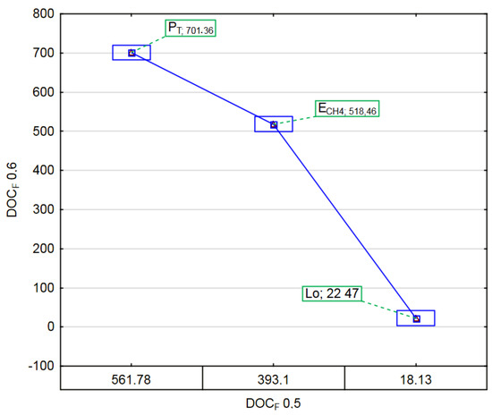 Moreover, a significant impact of DOCF parameter (carbon fraction ultimately subjected to decomposition) on the final result was observed. In fact, the value of DOCF = 0.5 was implemented in the IPCC model. It was foreseen (see Figure 7) that the growth of DOCF by 0.1 results in the increment of CH4 production by 19.9% and the increase in emissions by 24.2%, respectively.