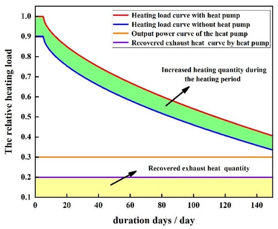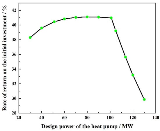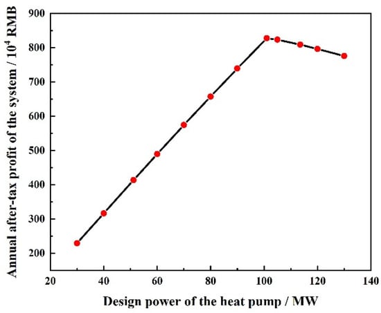 - As the heating load of the heating network is constantly changing during the heating period, the actual output power characteristics of heat pumps with different design powers are quite different, which causes the waste heat recovery system to operate at different modes. When the design power of the heat pump is lower than the minimum load of the heating network, the heat pump can always operate at the design power. However, when the design power of the heat pump is higher than the minimum load of the heating network, the heat pump can only operate under partial load in certain periods. Therefore, the reasonable selection of the design power heat pump is crucial to improve the economy of the waste heat recovery system.