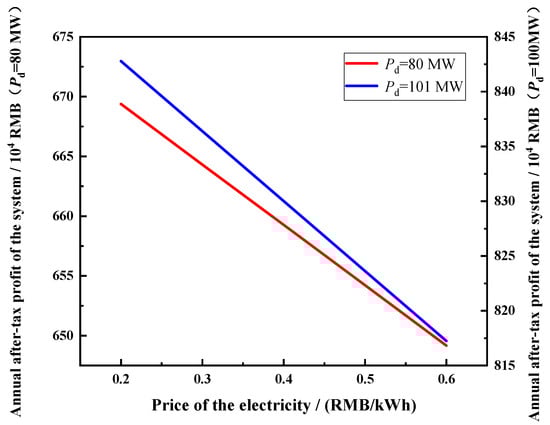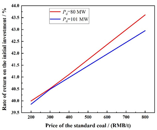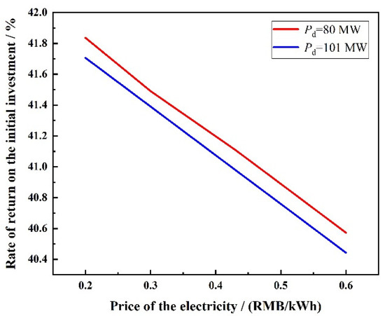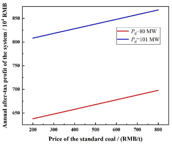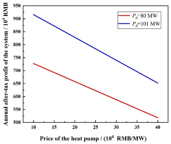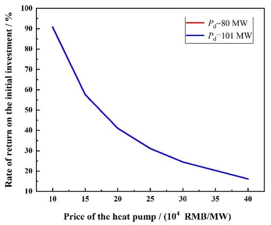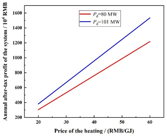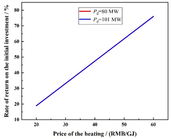 - The economic analysis of a 135 MW unit shows that the key parameters affecting the efficiency of the waste heat recovery system are the unit price of the recovery system and the heating price. Under the condition that the design power of the heat pump is 101.0 MW, when the unit price changes from 10 × 104 to 40 × 104 RMB/MW, the annual after-tax profit decreases from 910 × 104 to 652 × 104 RMB and the rate of return on the initial investment decreases from 90% to 20%. When the heating price changes from 20 to 40 RMB/GJ, the annual after-tax profit of the system increases from 382 × 104 to 1535 × 104 RMB and the rate of return on the initial investment increases from 19.0% to 76.0%. Therefore, a lower unit price of the recovery system or a higher heating price would considerably increase the efficiency of the system.