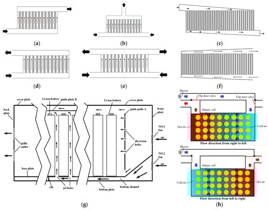 There are two kinds of air-based BTMS: one is based on natural convection of air, and the other on air-forced convection. Due to the thermophysical properties of air (the low heat capacity and low thermal conductivity), it is nearly impossible to use natural air to cool down the battery individually. For the forced-air BTMS, a higher flow rate is needed to obtain a similar cooling performance of the liquid-based BTMS. Due to low heat capacity, the forced-air cooling system’s temperature distribution is more uneven, which is a vital problem that needs to be solved. Two factors contribute to the uneven temperature distribution. On the one hand, the air temperature changes along the flow channel. On the other hand, the gaps between cells have different distances to the inlet and outlet so that the flow rate in different gaps varies. To solve this problem, symmetrical systems with uneven cell-spacing distribution and tapered cooling ducts were used in air-based BTMS [32]. Figure 2a–f shows “Z-type” and “U-type” flow channels, which have symmetrical modification and a tapered ducts design. Figure 2c,f presents a more uniform temperature distribution and could achieve higher performance with symmetrical designs. Except for the flow channel and cell arrangement, it is practical to enhance the heat dissipation of battery cells where the heat dissipation condition is poor. Figure 2g shows the design of adopting an extra duct to cool down the battery module center directly. Figure 2h shows reciprocating air flow in two directions could make the temperature more uniform. Both designs could be applied in poor local cooling environments.