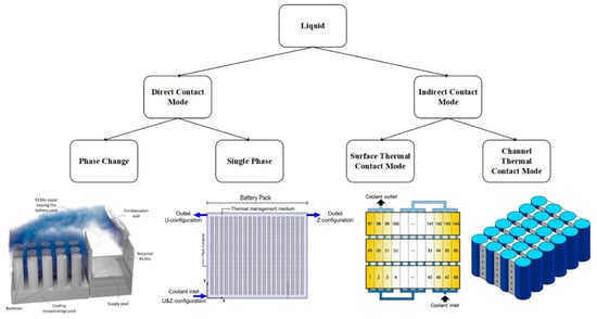 More BTMSs are based on liquid due to its high heat-transfer efficiency compared with forced-air cooling systems, which means liquid cooling systems consume much less energy than forced-air cooling systems, especially under the high heat load of battery cells [36]. The liquid cooling method also has some disadvantages, including complex devices, high cost and long startup period. A00/A0 class electric vehicles usually adopt air-based BTMS due to high price sensitivity. A-class EVs have higher requirements for endurance and adopt liquid-based BTMS. It is estimated that the price of liquid-based BTMS is 40% more than that of air-based BTMS [37]. Active BTMS based on the liquid can be categorized as the direct contact mode and the indirect contact mode [2]. The classification of liquid cooling and examples are shown in Figure 3.