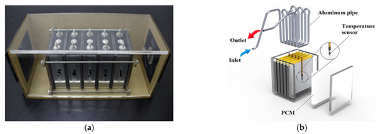 Pure passive BTMS based on PCM or CPCM is always not enough to maintain the temperature of the battery pack in an appropriate range because of heat accumulation caused by the inefficient cooling of natural air cooling. In this way, active cooling strategies play an essential role in recovering the thermal energy storage capacity of PCMs. The BTMS in Figure 5a adopts CPCM (copper mesh and enhanced paraffin/expanded graphite) and copper fins exposed from the CPCM to enhance the heat transfer [57]. The BTMS in Figure 5b adopts cooling water pipes and PCM [58]. The structures of this kind of hybrid BTMSs are like the indirect contact mode in the liquid-based BTMS.