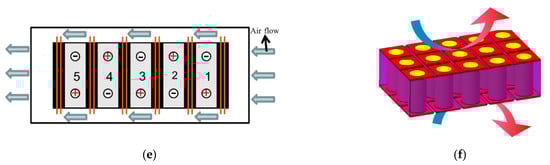 There are some novel designs to increase the performance of hybrid BTMS adopting forced-air cooling coupled with PCM. Shi et al. [64] (see as Figure 6c) developed a BTMS and built an unsteady mathematical model. This BTMS is proved to have the ability to hold the battery temperature in an appropriate scope before the PCM completely melts. Jiang et al. [65] (see as Figure 6d) designed a BTMS adopting baffles to change the airflow direction in order to enhance its heat transfer. Situ et al. [66] (see as Figure 6e) developed a novel quaternary PCM plate consisting of paraffin, expanded graphite, low-density polyethylene and double copper mesh (DCM). Lazrak et al. [67] (see as Figure 6f) developed a novel BTMS based on PCM, and adopted a new way to enhance heat dissipation in the PCM by using copper grids. The two AI plates are on the two sides of the PCM and the battery cells. A fan was used to ventilate.