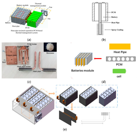 PCM is easy to integrate into hybrid BTMS, and the adoption of PCM increases the thermal uniformity. Similar to the mode “PCM plus active cooling”, HP is adopted to solve the heat saturation in PCM due to its high efficiency and quick response. PCM could be filled between HP and HTF [71] (see as Figure 8a) or battery cells. Lei et al. [72] combined PCM, HP and spray cooling to manage the battery pack temperature (see as Figure 8b). This BTMS controls the temperature rise of the battery surface by less than 8 °C, even in 24 A discharge current and a high ambient temperature (40 °C). Amin et al. [73] design a BTMS (see as Figure 8c) that can maintain the battery temperature below 50 °C at the maximum heat load of 50 W. Huang et al. [74] designed a BTMS (see as Figure 8d), in which HP makes a huge contribution to heat transfer and thermal uniformity. Wu et al. [75] designed a HP-based BTMS assisted by PCM and forced-air cooling (see as Figure 8e). Even under the highest discharge rate (5 C), of the battery pack could be controlled below 50 °C. For this combination, the necessity of adopting HP in this kind of BTMS should be discussed. The result shows that when the discharge rate is low, air velocity doesn’t have a strong connection to the thermal performance due to the PCM.