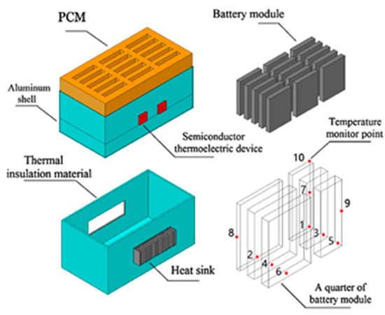 Thermoelectric cooling (TEC) does not have a wide application on BTM of EV due to its low efficiency. However, it has been widely used in cooling electronics for its compact structure. Researchers add TEC in hybrid BTMS to enhance the heat transfer or achieve some special purposes. Figure 9 shows a typical structure of TEC in hybrid BTMS. Lyu et al. [76] combined TEC with active cooling methods. TEC transfers the heat from the condenser side and forced air assists TEC to move the heat to the outer space. The result shows that the temperature of the battery surface battery drops to 12 °C from 55 °C. Song et al. [77] designed a BTMS for standby batteries combining semiconductor thermoelectric device and PCMs (see as Figure 10) and tested the cooling time (14 h) and heat preservation (4.15 days) time in a circular way under the ambient temperature (323 K).