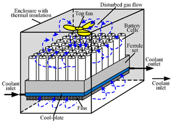 Few researchers use forced-air cooling and liquid cooling simultaneously. A practical way is to combine LCP with forced-air cooling. Wang et al. [79] designed a BTMS under the space environment combining the gas circle and a LCP (see as Figure 11). They investigated the effects of different assembly structures, the intensity of the gas and liquid cycles on the thermal performance of BTMS. It was found that the structure with a fan under the LCP could make the flow field fully developed. Compared with pure LCP cooling in the vacuum packaged battery, the general and are reduced by 3.45 K and 3.88 K under the condition that the total heat generation is 576 W. The direct contact mode based on liquid cooling is hard to integrate with forced-air cooling.