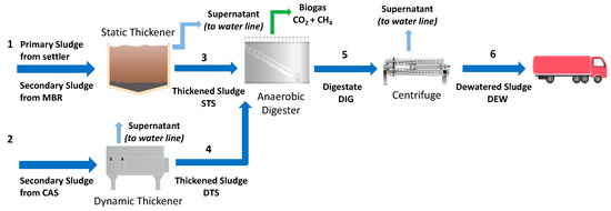 Scheme of Trento municipal WWTP, Italy, identifying four sludge samples (STS–Pipe 3; DTS–Pipe 4; DIG–Pipe 5; DEW–Pipe 6). Figure modified from Merzari et al. [18].