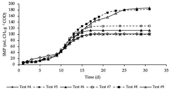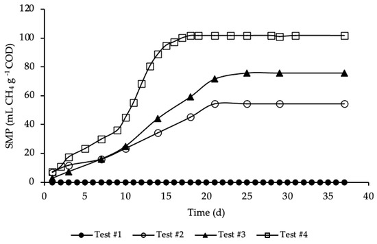 BMP tests were performed in mesophilic conditions for more than 35 days, until biomethane production had almost ceased. The average SMP trends for test#1, #2, #3 and #4, evaluated according to Equation (5), are reported in Figure 3.
