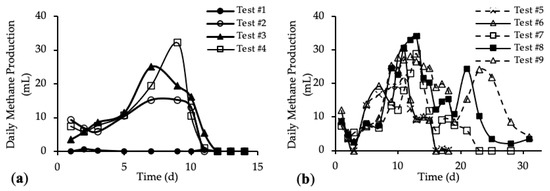 The daily methane production (DMP) is reported in Figure 5a,b. DMP trends with standard deviation are reported in Figure A3 in Appendix A.