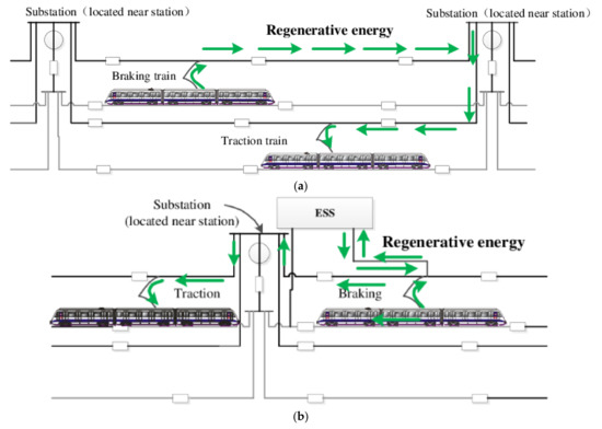 Figure 1. Recovery of braking energy: (a) reversible substations (RSSs); (b) energy storage systems (ESSs). - Energy storage systems (ESSs): store braking energy surplus and return it to the contact line when necessary (Figure 1b [4]), thus limiting the energy taken from the network [5].